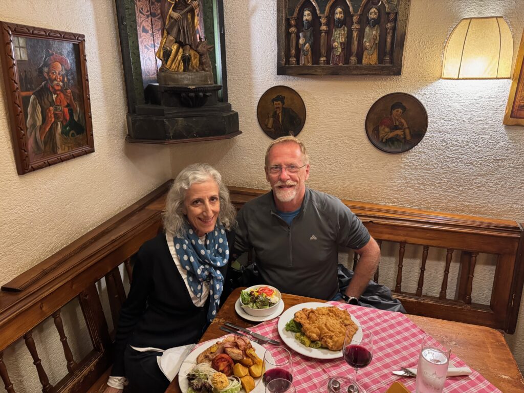 On return from Bratislava, we ducked into a traditional Viennese restaurant – to escape the light rain and enjoy some schnitzel served by waiters in Lederhosen. An enjoyable dinner.